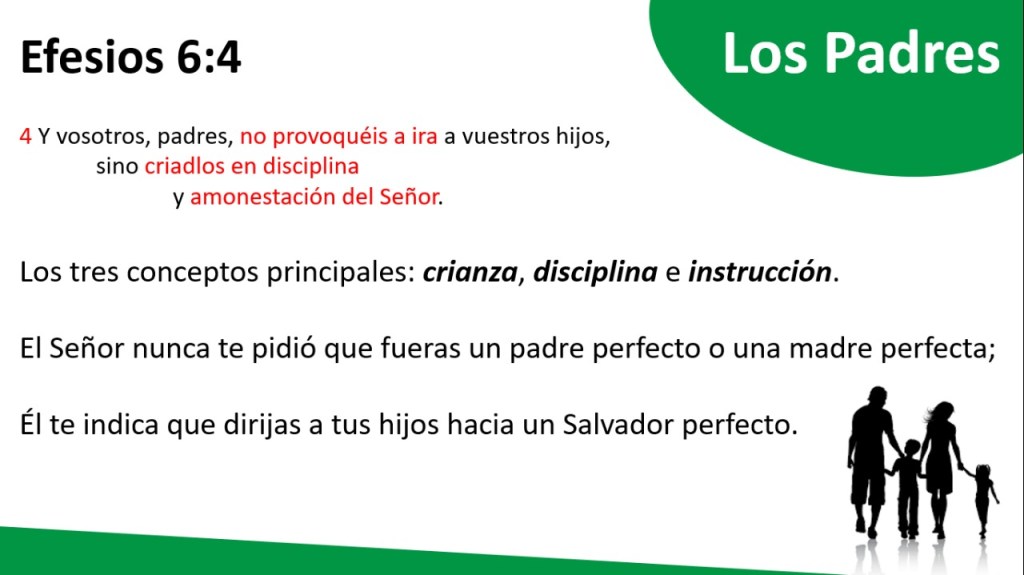 “no provocar a ira a vuestros hijos, sino criadlos en disciplina y amonestación del Señor.” Pablo enfatiza tres conceptos principales: crianza, disciplina e instrucción. El Señor nunca te pidió que fueras un padre perfecto o una madre perfecta; Él te indica que dirijas a tus hijos hacia un Salvador perfecto.