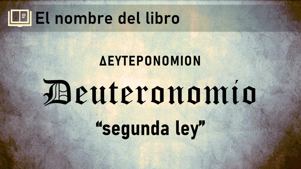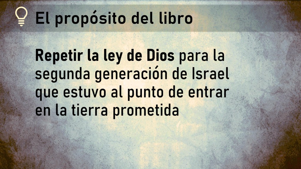 El libro de Deuteronomio, el quinto y final libro del Pentateuco, saca su nombre de una palabra griega que signfica «seguna ley.» El libro tiene como propósito repetir la ley de Dios para la segunda generación de Israel que estuvo al punto de entrar en la tierra prometida. El tema principal de Deuteronomio enfatiza la necesidad de obediencia a la ley de Dios desde el corazón. Dios quería que su pueblo, la nación de Isael, no solamente le obeciera, sino también le amara.