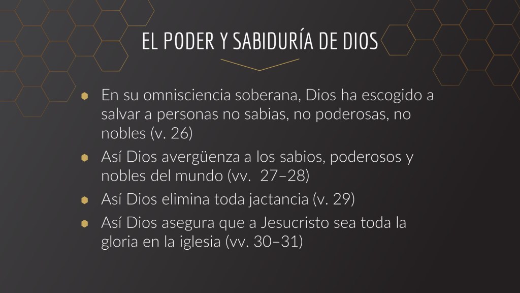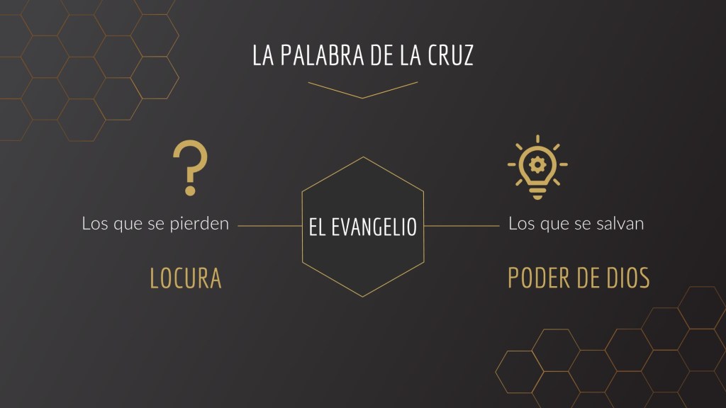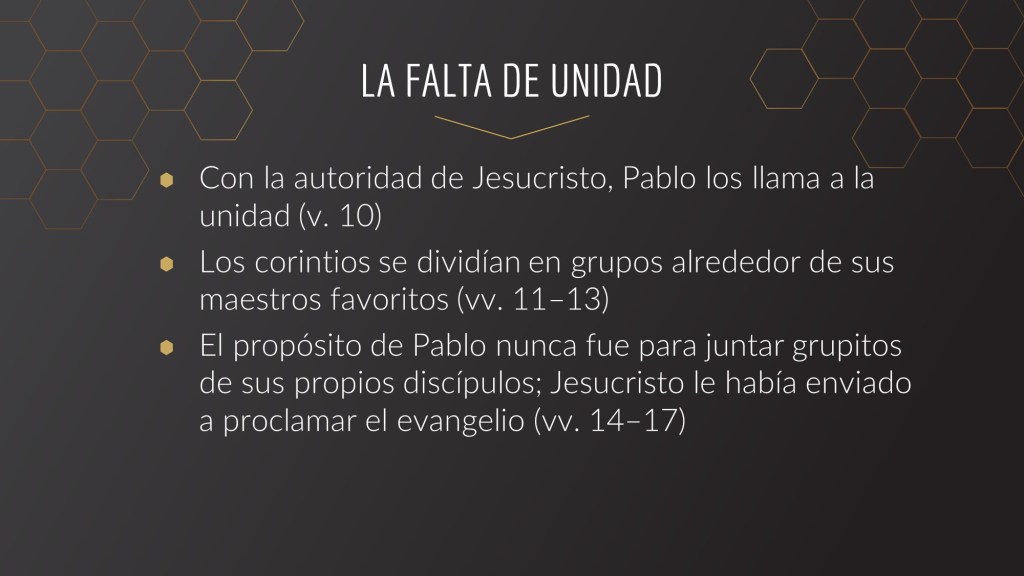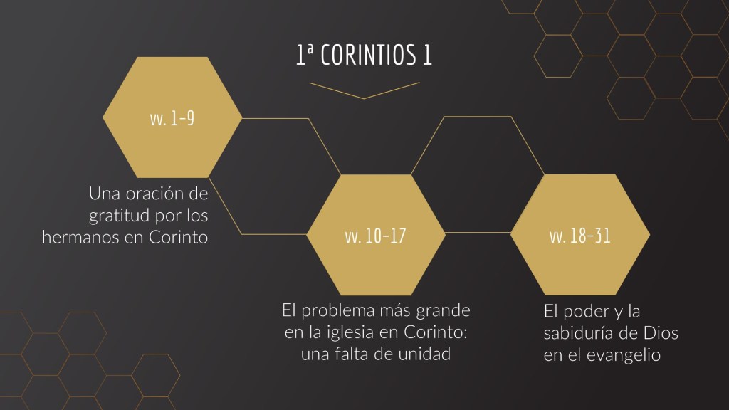 En el primer capítulo, Pablo da gracias a Dios en oración por su obra en la vida de la iglesia en Corinto. Enfrenta el problema más grave en la iglesia, la falta de unidad, llamándolos a la unidad por la autoridad de Jesucristo. La verdadera unidad en la iglesia es basada en el evangelio, las buenas noticias de la persona y la obra de Jesucristo.