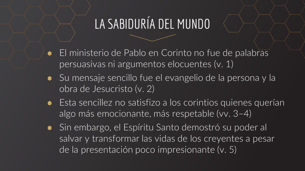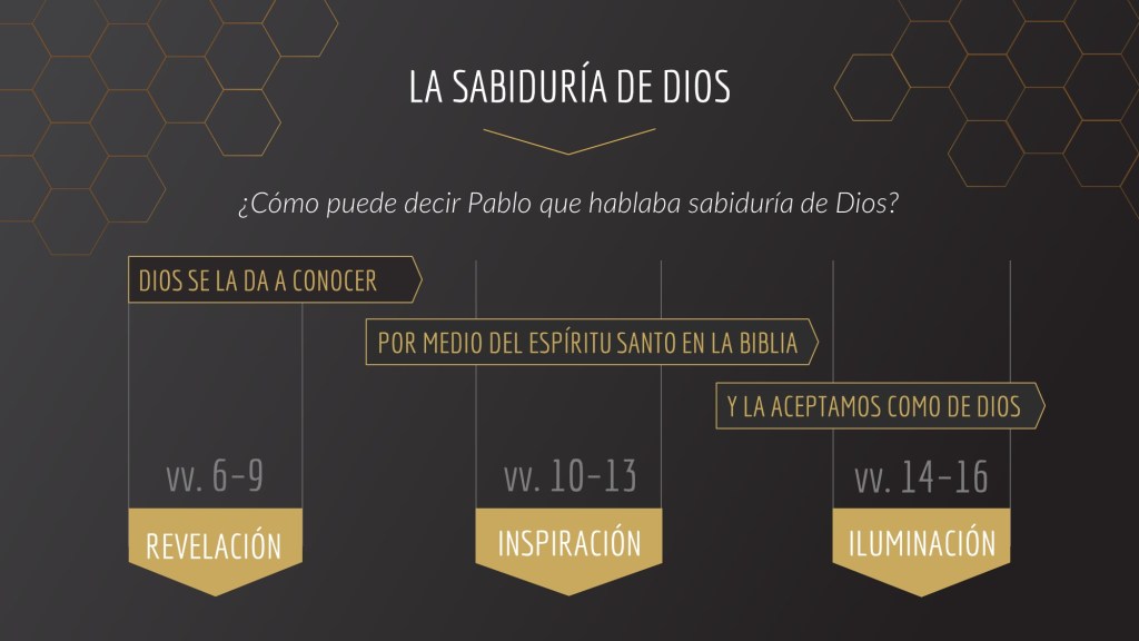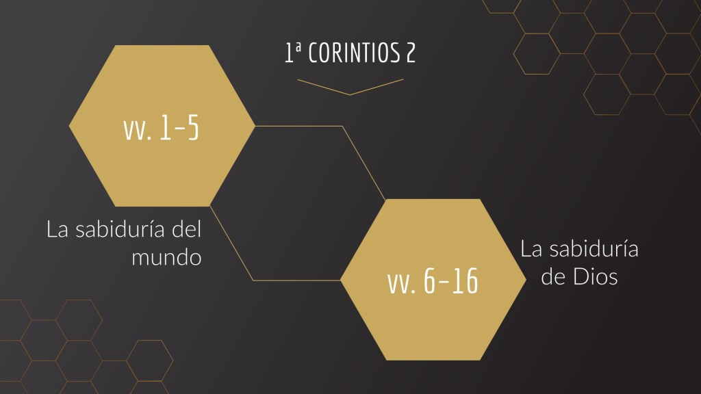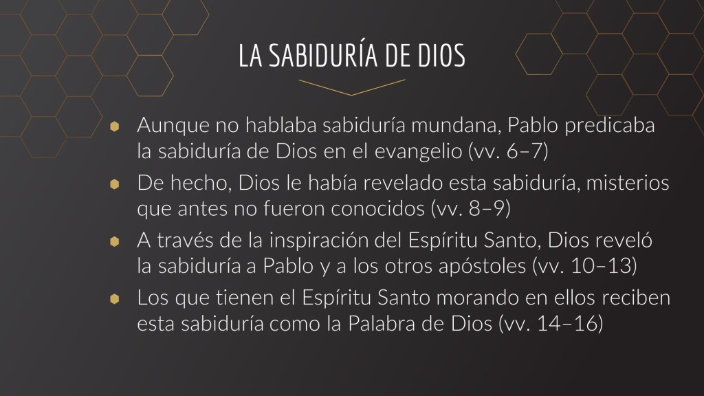 En el segundo capítulo, Pablo aborda el tema de la sabiduría. Los corintios estaban decepcionados con la presentación poco impresionante de Pablo, pero dice que sí habla sabiduría—la sabiduría de Dios. Esa sabiduría Dios le había revelado por medio del Espíritu Santo (el proceso que se llama la inspiración) para que Pablo presente la sabiduría de Dios mismo. Y dice que los creyentes, los que tienen el Espíritu Santo morando en ellos, siempre reciben y aceptan la sabiduría de Dios.