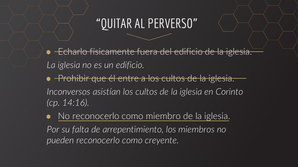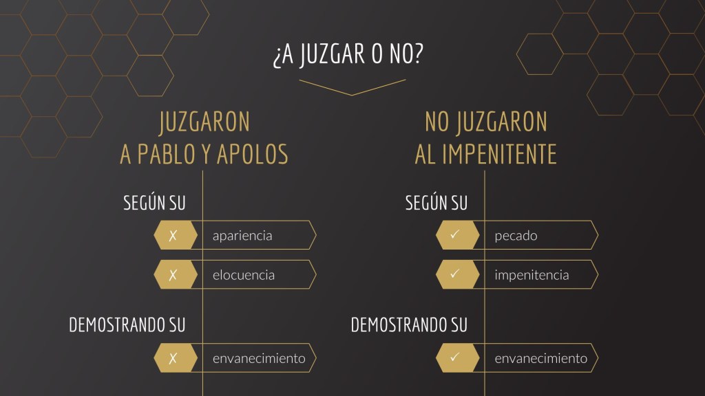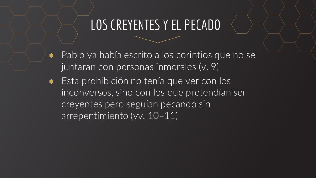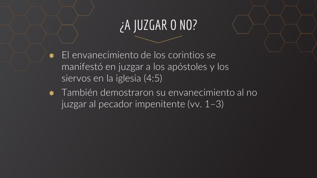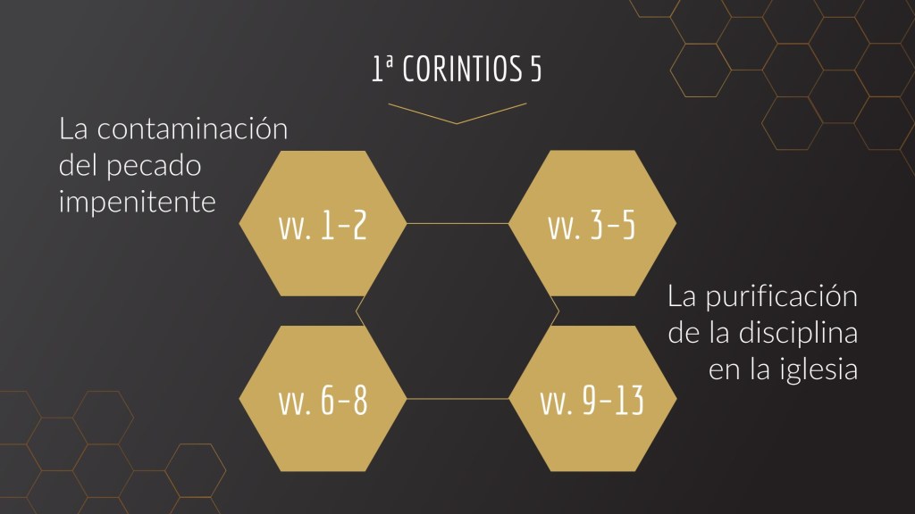 En el quinto capítulo, Pablo enlaza su tratamiento con el problema de la falta de la unidad en los capítulos 1–4 y el capítulo 5 con el tema del evanecemiento. Los corintios demostraron su orgullo al juzgar a los siervos de Dios y al no juzgar al pecado impenitente dentro de la membresía de la iglesia. Es necesario entender que el pecado contamina la iglesia y es por la disciplina de la iglesia que Dios purifica la iglesia y trata con el pecador. Como ilustración, Pablo dice que un poco de levadura hace fermentar toda la masa. El evangelio siempre produce una vida santa, debemos recordar que Dios nos salvó para vivir en santidad.