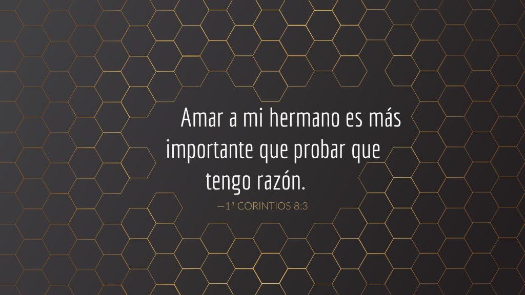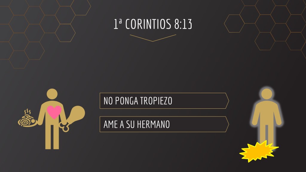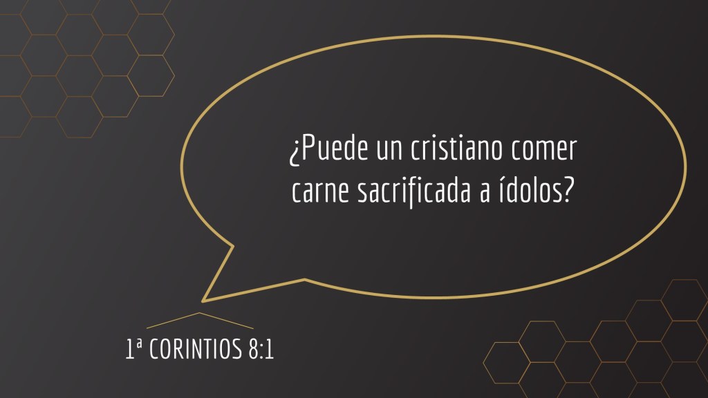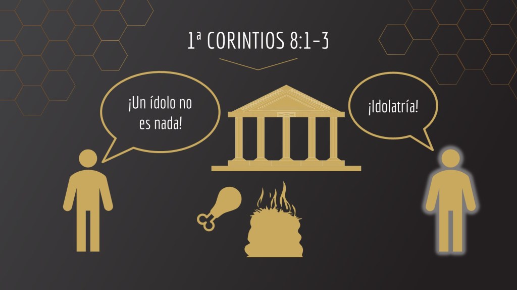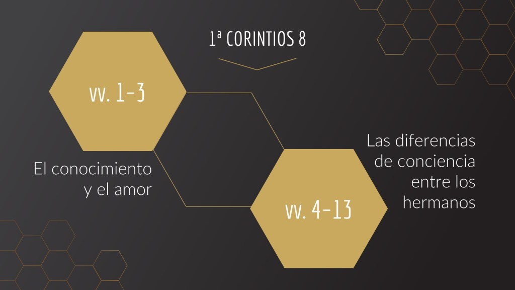 En este capítulo, Pablo responde una duda de los corintios sobre la carne sacrificada a ídolos en los mercados de Corintio. ¿Puede un cristiano comer carne ofrecida en los templos de ídolos? Para responder, Pablo señala que no es un tema de conocimiento, de quién tiene razón y quién está equivocado. Debemos ver todo desde la perspectiva del amor para mi hermano (vv. 1–3)—el conocimiento envanece, pero el amor edifica.