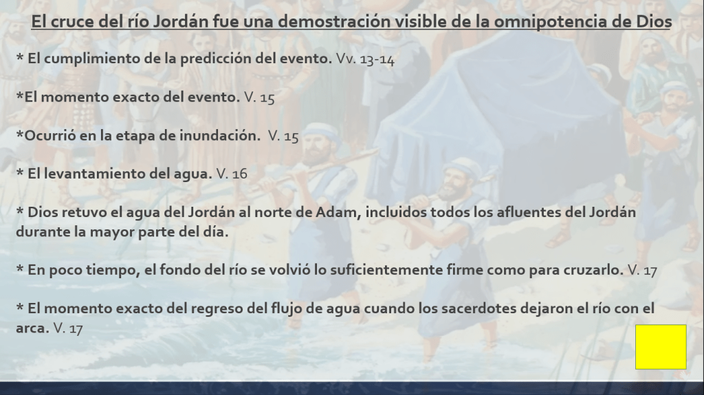 Los espías enviados por Josué a reconocer la tierra trajeron un informe favorable que confirmaba al pueblo los planes divinos para hacerlos pasar el Jordán y entregarles la tierra prometida. El primer versículo muestra el río Jordán como la barrera que impedía al pueblo de Israel alcanzar el lugar de bendiciones que Dios tenía preparado para ellos. El paso del río tendría que ser facilitado por el Arca del Pacto.