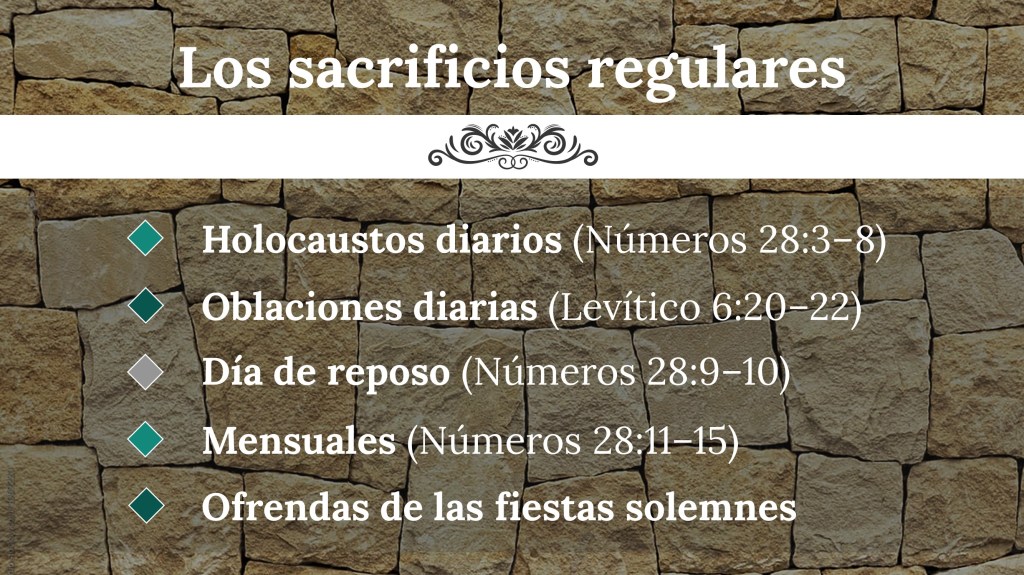 - Sacrificios regulares fueron ofrecidos continuamente cada _________, cada ___________, cada __________ y cada _____________.