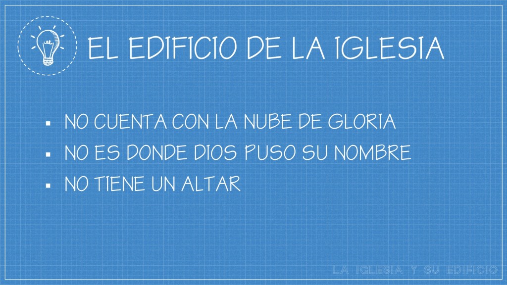El edificio de la iglesia no cuenta con la nube de gloria que representaba la presencia de Dios en forma visible en el templo, tampoco está ubicado donde Dios puso su nombre (el monte Sion en Jerusalén) y no tiene ningún altar, porque tenemos un sacrificio eterno, permanente, e infinito en Jesucristo. Por eso, no queremos confundir el templo del Antiguo Testamento con el edificio de la iglesia.