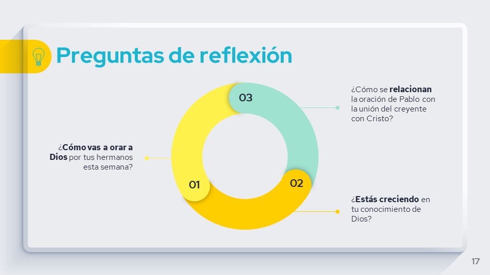 En los versículos 1:15-23, el apóstol Pablo ora por sus hermanos a Dios para que el Señor les conceda más conocimiento de Él a fin de conocer mejor la esperanza, la herencia y el poder que opera en ellos gracias a la unión que tienen con Cristo.