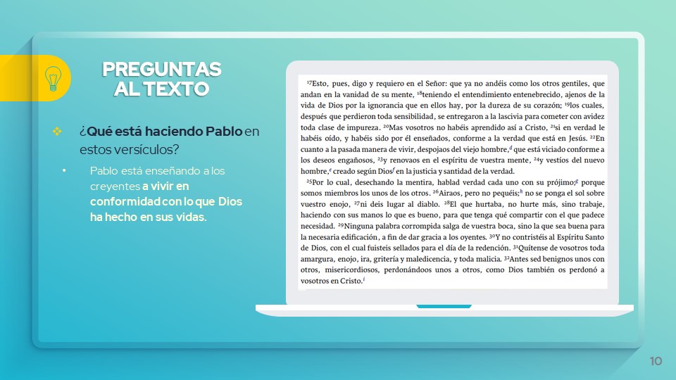 - Verdadero o Falso: En el capítulo 4 de la carta a los Efesios Pablo enseña que los creyentes deben vivir en conformidad con la obra de Dios en sus vidas___