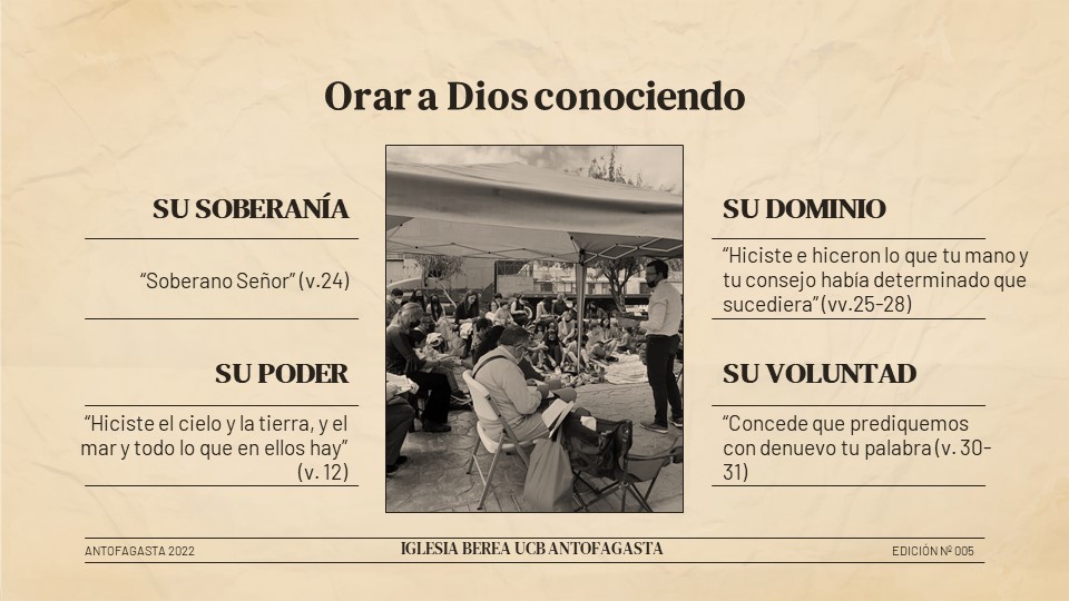 En segundo lugar, tal vez podemos preguntarnos como iglesia, ¿Qué tan acabado es nuestro conocimiento del carácter de Dios, del plan de Dios y del propósito de Dios para la iglesia? Como vemos en texto, la iglesia oró a Dios teniendo un acabado conocimiento de la soberanía de Dios sobre la creación y la historia; y en confianza y dependencia a Él pidió en la misma dirección de la voluntad de Dios en medio de las circunstancias que vivían. Muchas veces cantamos preciosas canciones que hablan de la soberanía de Dios. Y me pregunto, ¿Son solo palabras las que cantamos? ¿O realmente creemos que Dios es Soberano y que tiene poder para ayudar a hacer lo que hoy Dios quiere que hagamos, y eso es predicar su Palabra?