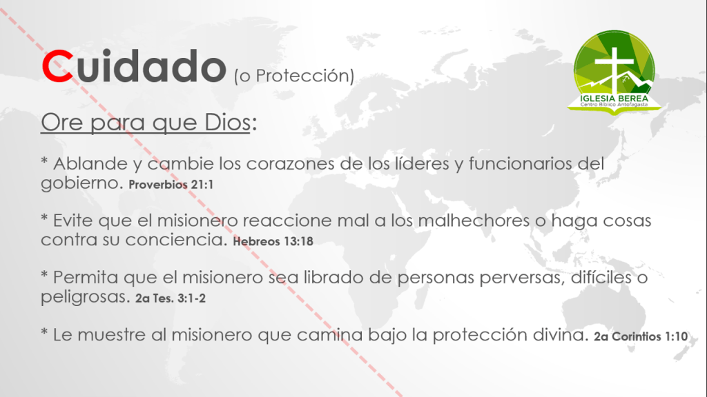 Orar por el cuidado o la protección de Dios para su misionero es de vital importancia. El apóstol Pablo escribió, “Por lo demás, hermanos, orad por nosotros, para que la palabra del Señor corra y sea glorificada, así como lo fue entre vosotros, y para que seamos librados de hombres perversos y malos; porque no es de todos la fe.” 2ª Tes. 3:1-2