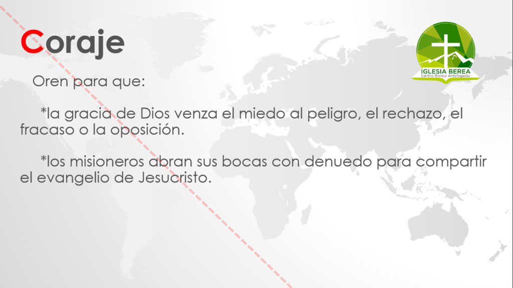 Me gustaría compartir con ustedes la segunda parte de una guía sencilla que pueden utilizar para orar por los misioneros. Esta guía incluye siete peticiones de oración específicas que provienen de las Escrituras. Hay muchas cosas por las que podemos orar, pero el énfasis de esta guía estará en siete palabras o conceptos que comienzan con «C«