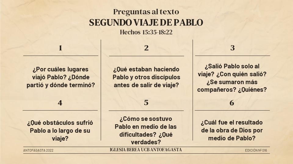 1. ¿Por qué lugares viajó Pablo cuando salió por segunda ver a predicar el evangelio a las naciones? ¿Desde dónde partió, y dónde terminó su recorrido?