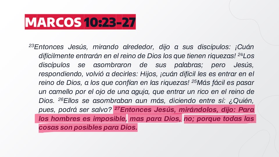 Si su respuesta es sí, entonces, mira nuevamente este texto (Marcos 10:17-27). Entiende que no hay nada que puedas hacer ni poseer para alcanzar la salvación. E inclusive, aunque conozcan aquello que te falta; y que sí o sí es creer a Jesucristo como Señor y Dios y seguirle, aunque sepas esto, entiende lo siguiente: No puedes creer ni seguir a Jesús con tus propias fuerzas. Tus manos están demasiado llenas de pecado y confianza en ti mismo como para creer en Jesús; tus manos están demasiado llenas con cosas que has logrado en tu vida y que te dan confianza, y no podrás soltarlas todas para aferrarse a Jesús con todas tus fuerzas; no podrás. Sin embargo, Dios tiene poder. Para Él nada es imposible. Por tanto acércate a Él suplicante, no buscando respuestas en cuanto a qué más de debes hacer (como lo hizo el joven rico), sino que acércate a Dios sabiendo que Él es poderoso para salvarte en Cristo Jesús; y pídele que te ayude a cree en Él, y síguele, reconociendo que Jesús es Dios y Señor, y tu única esperanza.