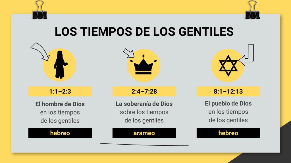 Los primeros seis capítulos contienen narrativas, o historias, que dan detalles de los encuentros de los reyes de los gentiles con el Dios de Israel. Los últimos seis capítulos contienen profecías del futuro, con muchísimo detalle.