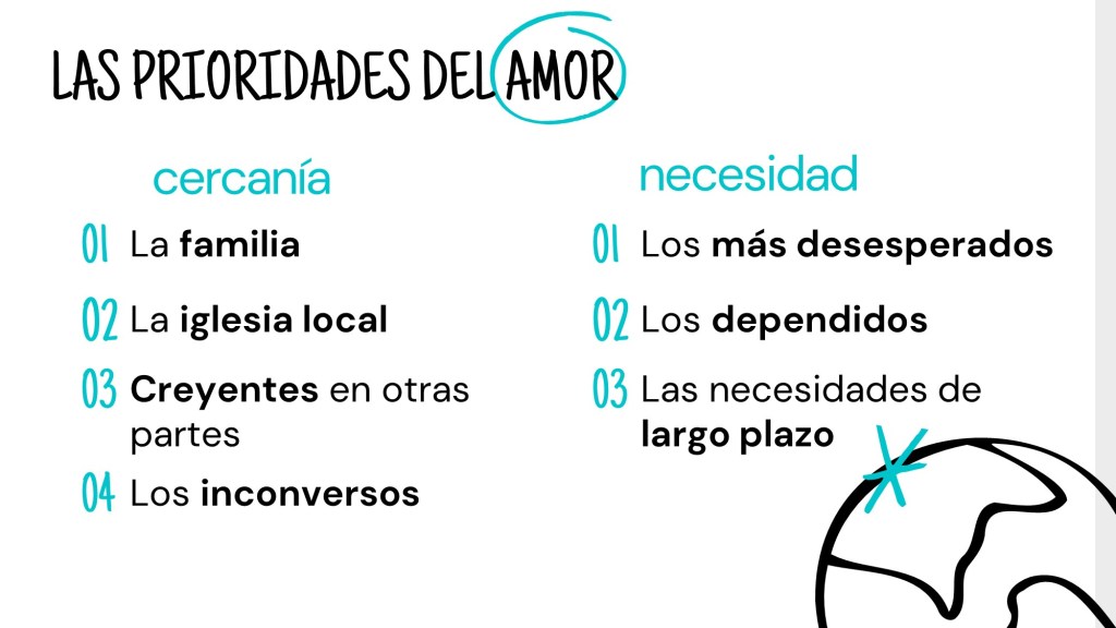 Dentro de las muchas necesidades, podemos ponerle la atención primero en las más cercanas: nuestra familia (1ª Timoteo 5:8), la familia espiritual (la iglesia local, y los miembros con quienes nos hemos comprometido para cuidarles), los creyentes más allá (Gálatas 6:10) y los demás. También podemos enfocarnos en las necesidades más grandes: los más desesperados (los que no tienen recursos ni defensa, como huérfanos y viudas, Santiago 1:27), los dependientes que no tienen otros recursos y las necesidades de largo plazo. El Nuevo Testamento nos instruye que no participemos con los maestros falsos (2ª Juan 10–11) ni con hermanos que pueden pero no quieren trabajar (1ª Tesalonicenses 3:10).