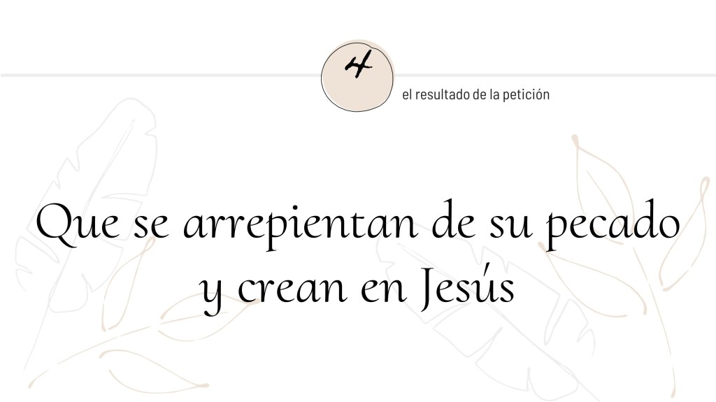 En cuarto lugar, podemos orar con confianza pidiendo que los inconversos se arrepientan de su pecado y crean en Jesús. Dios ha mandado que todos se arrepientan de su pecado y crean en Jesús, por eso, sabemos que es su voluntad.