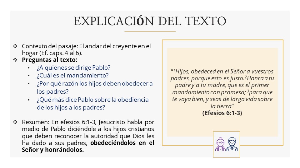 Claramente es: Hijos, obedezcan en el Señor a sus padres; y podemos aclarar desde ya que es: a ambos padres: Obedezcan a papá y a mamá. No solo uno de ellos o al que mejor les convenga. Jesucristo manda a los hijos creyentes a obedecer a papá y mamá.