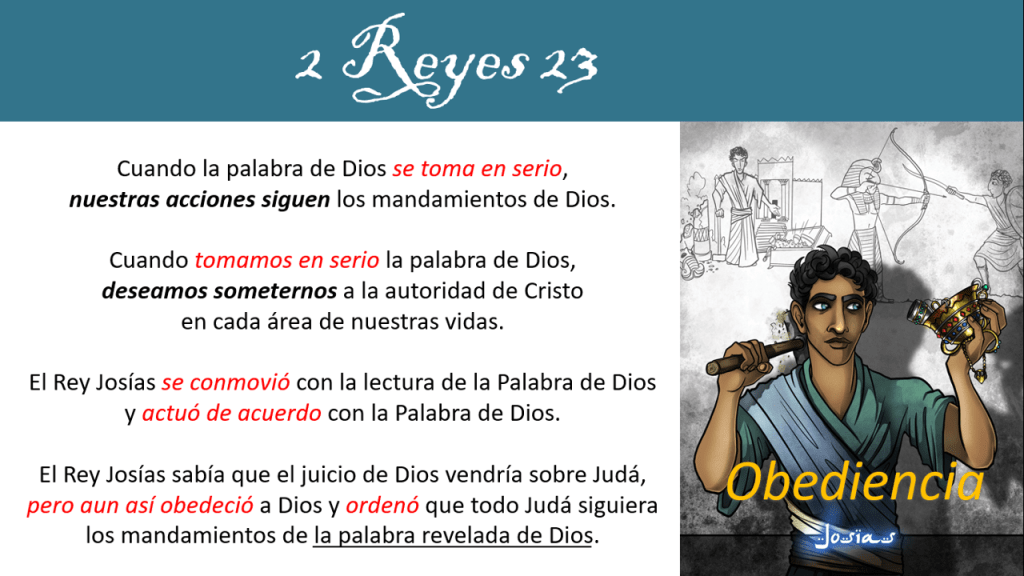De todo lo que acabamos de leer se puede sacar una gran lección para nosotros. Cuando la palabra de Dios se toma en serio, nuestras acciones siguen los mandamientos de Dios. Cuando tomamos en serio la palabra de Dios, deseamos someternos a la autoridad de Cristo en cada área de nuestras vidas. El Rey Josías se conmovió con la lectura de la Palabra de Dios y actuó de acuerdo con la Palabra de Dios. El Rey Josías sabía que el juicio de Dios vendría sobre Judá, pero aun así obedeció a Dios y ordenó que todo Judá siguiera los mandamientos de la palabra revelada de Dios.