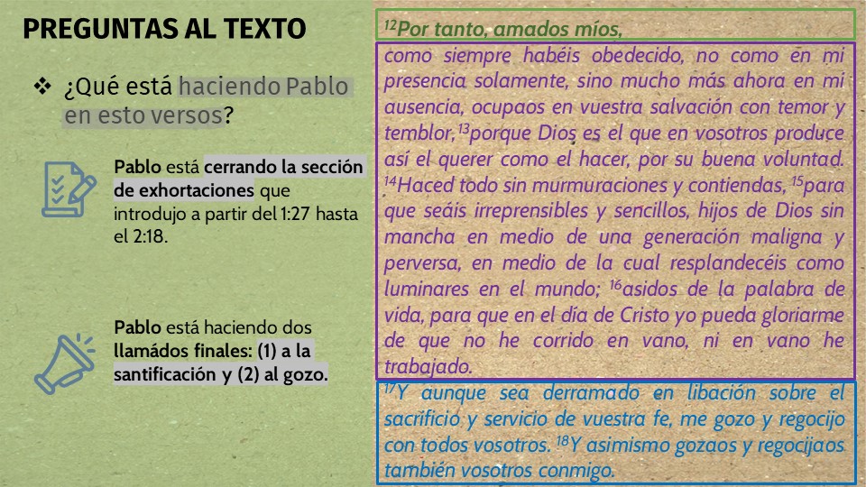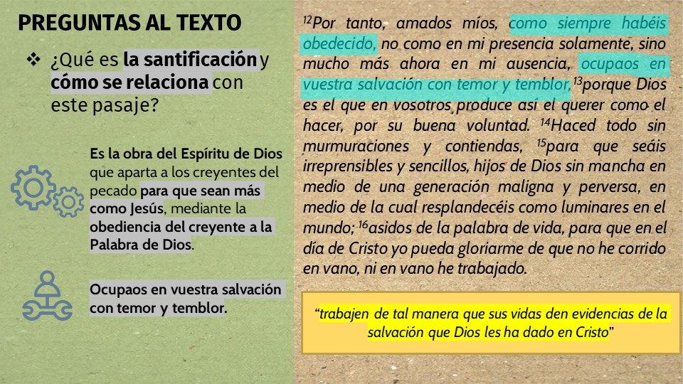 Sin embargo, el punto de Pablo aquí es el siguiente: No se lleven ese aperitivo a la casa ni a las vidas de sus hermanos, que no se sirvan del platillo de las quejas en nuestra iglesia, y ni siquiera pretendan sostener en sus manos las murmuraciones; no lleven el bocado de las murmuraciones a sus manos. Y la forma de logarlo es, tal como dice el verso 16, en lugar de considerar el rumor, aferrarse de la palabra de vida. Esa es la forma de no sentir atracción por el pecado de la murmuración y el chisme; sosteniendo firmemente la Palabra de Dios que da vida con el propósito de vivir según sus dichos y compartir con otros el mensaje del evangelio que da vida a todo aquel que cree. De esa es la manera los creyentes se santifican.