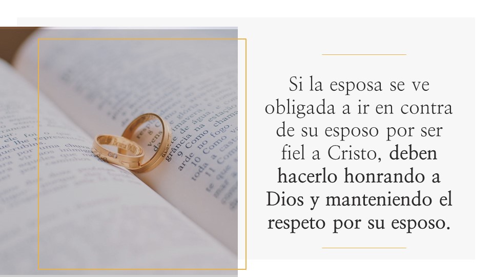 Dicho de otra forma, si un esposo está llevando a una esposa a pecar o a desobedecer a Cristo, esa hermana tiene el deber de sujetarse primeramente a Cristo, y no pecar. Su autoridad primeramente es Dios. Sin embargo, aun si se ve obligada a ir en contra de lo que dice su esposo por ser fiel a Cristo, ella debe seguir honrando a Dios manteniendo el respeto por su esposo. Y no me refiero a pecar de igual manera, sino a que «la forma» en cómo la esposa plantea sus diferencias o «las actitudes» que resultan de los desacuerdos, no deben mostrar irrespeto.