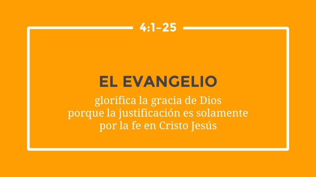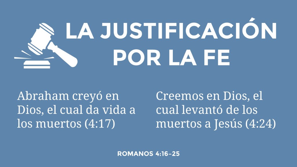 La fe de Abraham y su justificación por la gracia de Dios nos ayuda a entender que recibimos las bendiciones y promesas de Dios solamente por su gracia (4:16). Por ejemplo, Dios prometió que Abraham sería el padre de muchas gentes, o naciones, la misma palabra que se traduce “gentiles” (4:17; Génesis 17:5). Abraham creyó la promesa de Dios, aunque no parecía posible que fuese padre (4:18), porque no tenía hijo y tenía casi cien años y además su esposa Sara fue estéril (4:19). En vez de dudar de Dios, Abraham creyó, dando gloria a Dios (4:20–21). La fe de Abraham le fue contada por justicia (4:22), igual como a nosotros que creemos en Jesús (4:23–24). Jesús entregó su vida por nuestro pecado, y su resurrección dio evidencia de que nuestra justificación es segura (4:25).