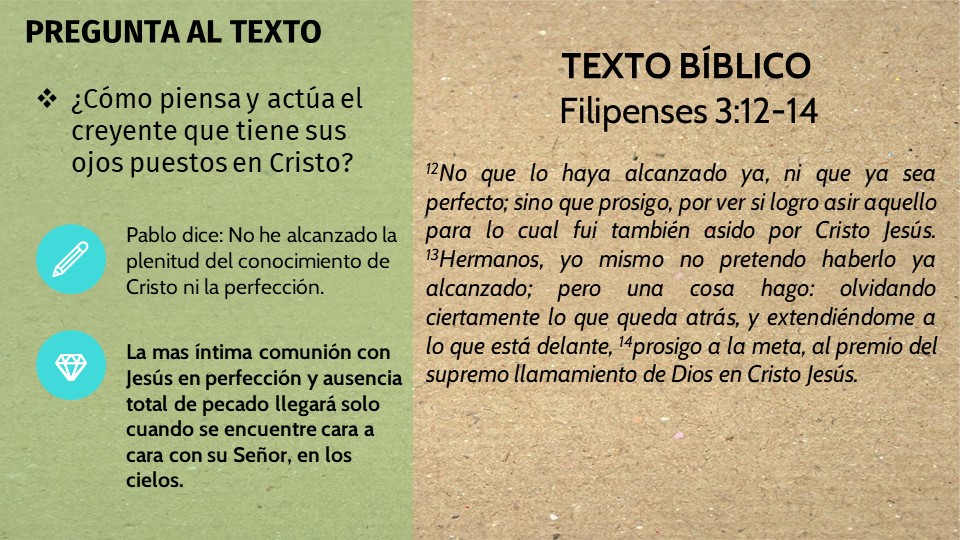 El pensar y el actuar del creyente que tiene su vista en Cristo está está profundamente influenciado por la determinación de seguir adelante, hacia la meta, para alcanzar el propósito de Dios y Su llamado. Y mientras avanza, ese creyente maduro que mira a Cristo está seguro que Dios le ha rescatado para sí, y le ha llamado para vivir en conformidad con el andar de Jesucristo, y le ha sacado de este mundo para ser hecho ciudadano de los cielos, en donde un día será reunido a su Salvador, y será transformado el cuerpo de su humillación para ser semejante al cuerpo de la gloria de Cristo.