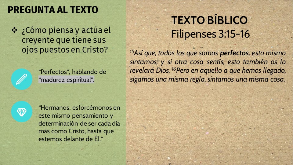 Hermanos, ¿De qué manera estamos viviendo nuestros días antes del regreso de Cristo? ¿Estás corriendo como Pablo? ¿Estás alejando tu vista teniendo tu mente llena de lo terrenal? ¿Cuál es tu meta? ¿Te has dejado distraer con tantas cosas que tu determinación por mirar a Cristo se ha diluido? ¿Estás pensando y actuando como aquellos que creyentes maduros que miran a Cristo y anhelan su regreso?
