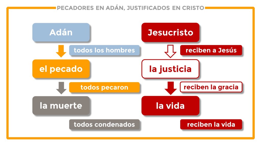 Ahora Pablo explica nuestra relación con Adán como seres humanos y nuestra relación con Jesucristo como los justificados. Adán, el primer hombre, pecó como el representante de toda la raza humana, y por eso, todos nacimos pecadores y vivimos pecando (5:12). La ley de Dios no creó el pecado, sino plasmó el pecado y concretó el castigo (5:13). Podemos ver la tiranía del pecado a lo largo de la historia, sobre todo, por el hecho de que todos los hombres, desde Adán hasta Moisés, murieron como consecuencia de su pecado (5:14).