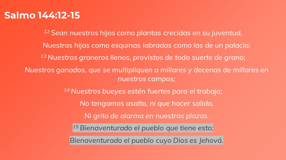 El salmo 144 termina con una serie de deseos del rey en cuanto a la prosperidad de su pueblo. En cierto sentido, podemos decir que el tenor de la oración cambia un poco porque pasa de la preocupación por la guerra a los deseos de estabilidad de la nación. Y en cuanto a esos deseos, en estos versículos hay varias ilustraciones bien poéticas que dejan ver las esperanzas del rey la paz y prosperidad del pueblo. Dice, por ejemplo, (1) que los jóvenes de la nación sean fuertes como plantas jóvenes, (2) que las jovencitas sean hermosas como las piezas de arte de un palacio. En cuanto la prosperidad, el rey dice (3) que los graneros estén llenos de toda clase de granos, y (4) los animales se multipliquen sobre el campo. Pero, por sobre todo, el rey desea que (5) el pueblo pueda vivir en paz y prosperidad, sin que de pronto tengan que huir a causa de las guerras o que se escuchen las alarmas que les indiquen búsqueda de refugio.