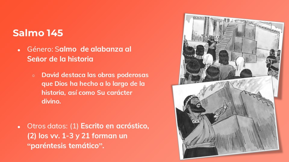 Ahora bien, en particular el salmo 145 corresponde al género de los salmos de alabanza al Señor de la historia, y sobre todo porque David, que es el autor de este salmos, destaca las obras poderosas que Dios ha hecho a lo largo de la historia como motivos más que suficientes para adorar Su nombre, para siempre.