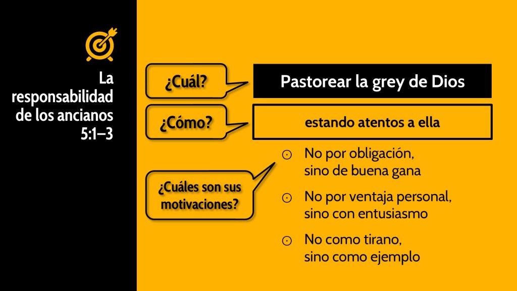 Pedro se dirige a los ancianos de las iglesias, rogando que pastoreen la grey de Dios humildemente (5:1–3). Es la grey de Dios, y su responsabilidad es pastorear esa grey al cuidar de ella. Ahora los ancianos pastorean la grey, y tienen la expectativa de recibir una corona del Príncipe de los pastores cuando venga (5:4). La iglesia a su vez, debe someterse a sus líderes, cubierta en humildad (5:5).