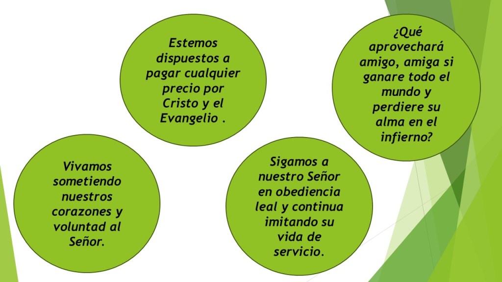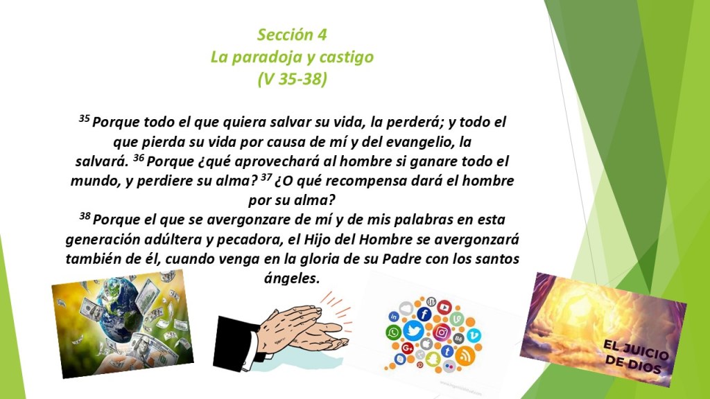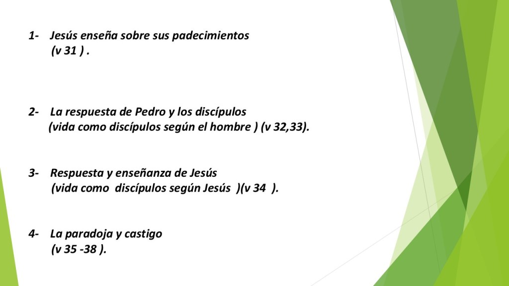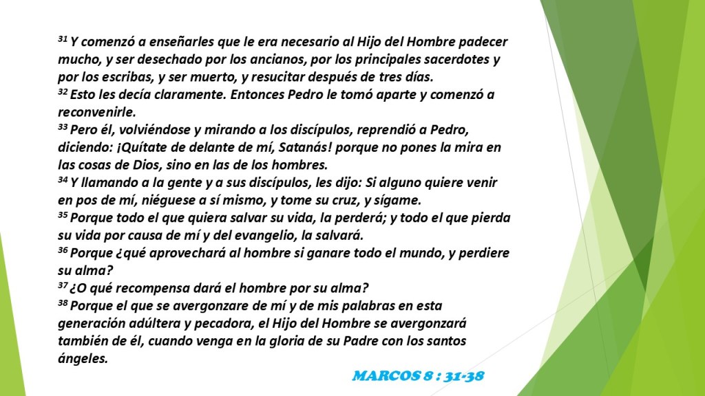 29/12/2024Andrés Maluenda Marco 8:31-38 – La vida como Discípulos según Dios y el hombre INTRODUCCIÓN EXPLICACIÓN DEL TEXTO BÍBLICO: MARCOS 8:31-38 APLICACIONES FRASE DE RESUMEN Comparte esto: Compartir en X (Se abre en una ventana nueva) X Comparte en Facebook (Se abre en una ventana nueva) Facebook Compartir en WhatsApp (Se abre en una ventana nueva) WhatsApp
