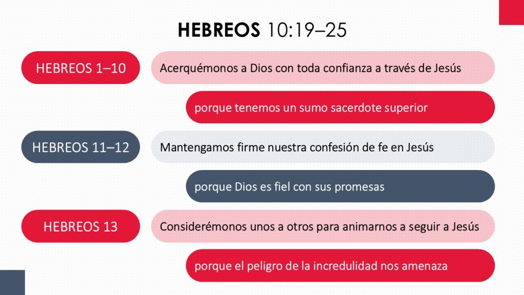 En Hebreos 10:19–25 el autor da tres mandatos (en primera persona) que son la aplicación de todo lo que nos ha explicado en los capítulos 1 al 10. El autor nos recuerda de que tenemos en Jesucristo dos ventajas que los santos del Antiguo Testamento nunca tuvieron: podemos acercarnos a Dios confiadamente y directamente a través de la obra de Jesús (10:19–20), y tenemos en Jesús un sumo sacerdote eterno siempre intercediendo por nosotros (10:21).
