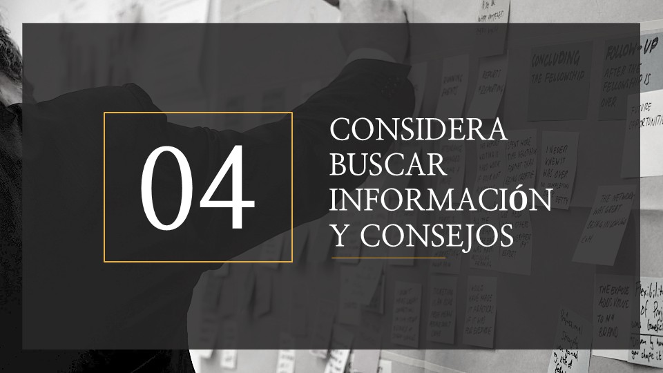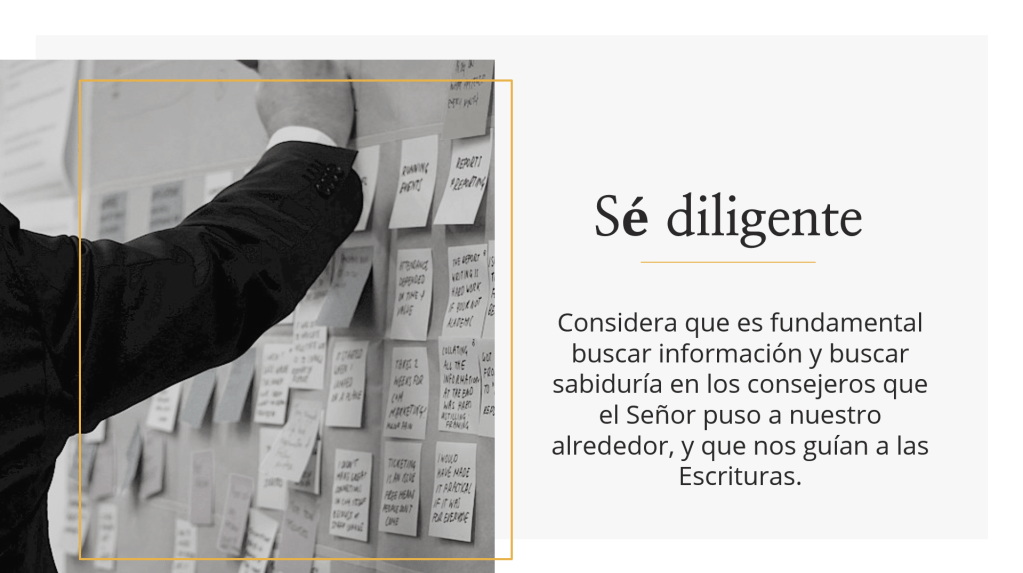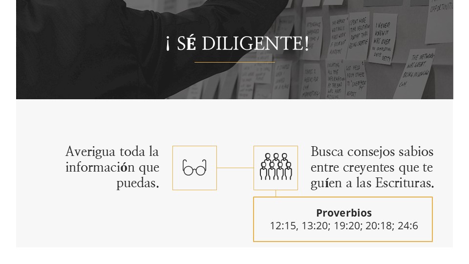 Sé diligente: (1) Evita la desinformación y el idealismo sin fundamento. En lugar de ello, averigua todo lo que puedas sobre el asunto que estás pensado; detalles y otras opciones. Busca también información en la Biblia sobre el tema que es parte de tu decisión. (2) Así como es fundamental la búsqueda de información, también lo es el buscar consejos de personas que te guíen a las Escrituras.