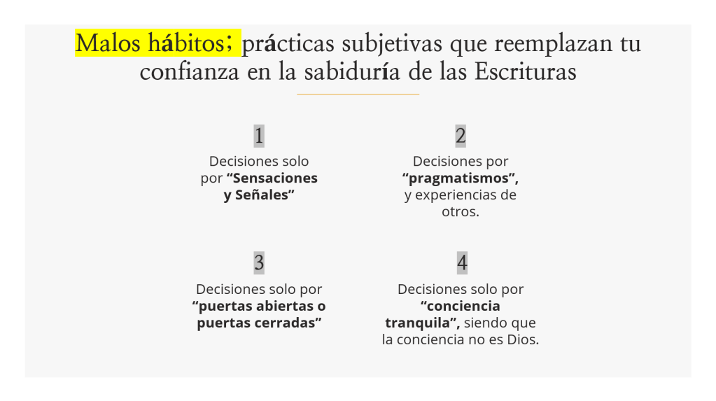 Evita malos hábitos; es decir, aquellos que buscan reemplazan tu confianza en la sabiduría de las Escrituras por aplicaciones personales y subjetivas