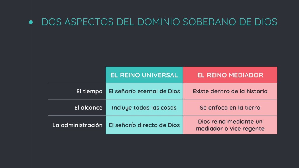 Mirando todo el panorama de la Biblia, un tema central es el reino de Dios. Más allá de solamente esa frase, el concepto del reino de Dios es amplio y profundo a lo largo de las Escrituras. Podemos identificar dos aspectos del dominio soberano de Dios: el reino universal, la soberanía absoluta de Dios en todo momento sobre todas las cosas y el reino mediador, el reino de Dios en la tierra mediante el hombre escogido por Dios.