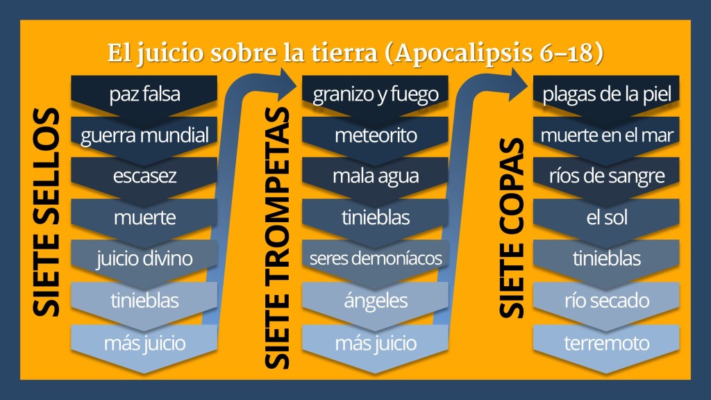 Los juicios de la Tribulación caen en tres series de siete juicios, en que el último juicio abre otra serie de juicios. La primera serie son los sellos del rollo en la mano de Jesús, y cada vez que rompe un sello, se lanza un juicio sobre la tierra (Apocalipsis 6–7). Después siete ángeles tocan una trompeta, anunciando otro juicio sobre la tierra (Apocalipsis 8–11). La tercera serie son copas llenas de la ira de Dios que los ángeles echan sobre la tierra (Apocalipsis 12–18).