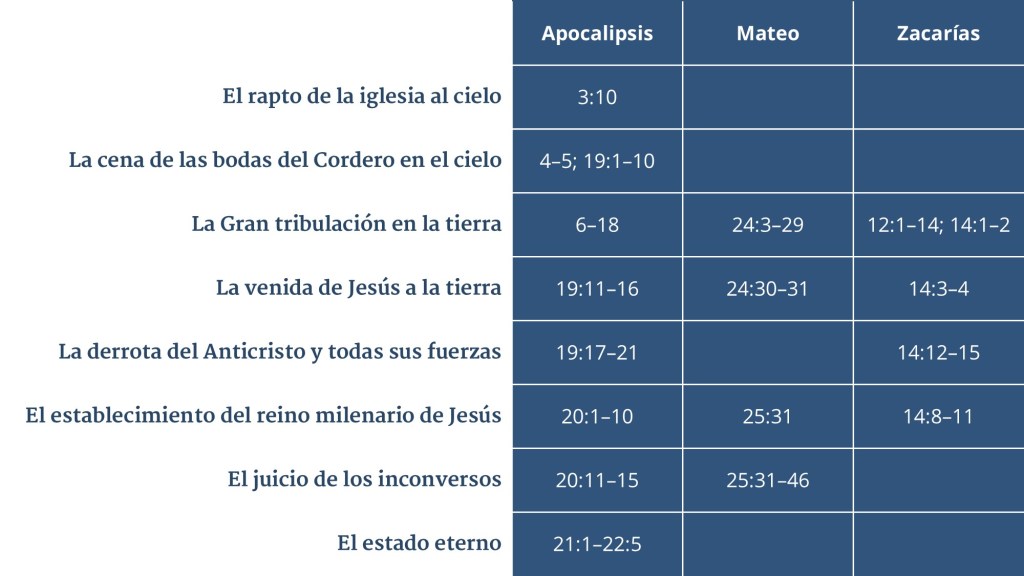 El estudio de la escatología es el ramo de la teología que aborda los eventos futuros. Podemos correlacionar algunos pasajes de la Biblia que hablan de la venida de Jesucristo a la tierra para organizar las informaciones que Dios ha revelado. Para este estudio, vamos a considerar principalmente el libro de Apocalipsis, Mateo 24–25 y Zacarías 14.