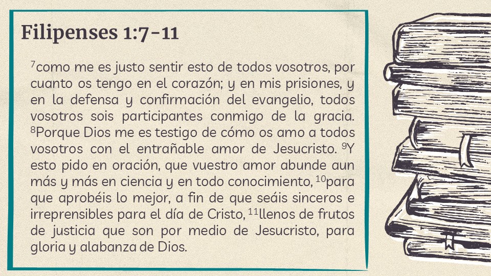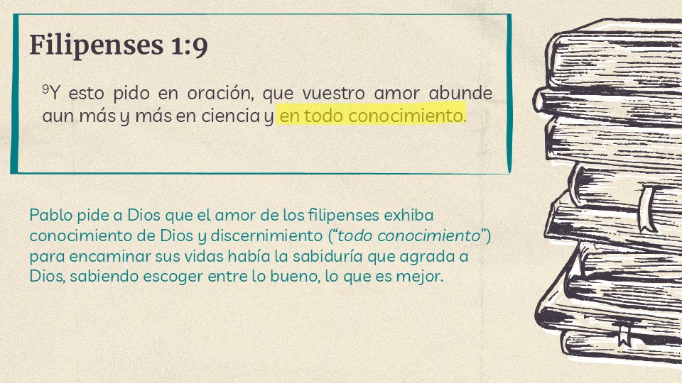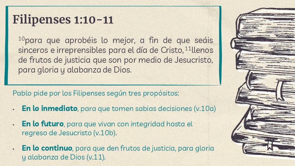 Pablo deseaba que los filipenses se conduzcan cada día tomando buenas decisiones; dando buenos frutos de nueva vida en Cristo: amando a Dios y a la iglesia, preparándose para la venida de Cristo, pensando y creciendo en unidad, gozándome en el Señor y viviendo para la gloria de Dios. Llenos de un amor creciente guiado por el conocimiento de Dios y discernimiento sabio, para la gloria de Dios.