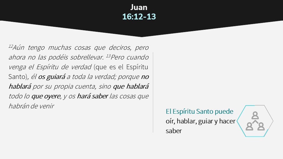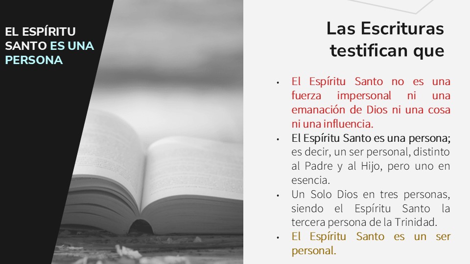 Más bien, Él mismos se da a conocer a través de las páginas de las Escrituras, y es a través de ellas que nosotros hemos recordado hoy que el Espíritu de Dios tiene (1) Inteligencia, (2) Emociones, (3) Voluntad, (4) Realiza acciones como persona, (5) Se relaciona con otras personas, (6) Y finalmente, la Palabra de Dios y Jesucristo se refieren a Él como un ser personal, a quien se le debe obedecer (Hch. 10:19-21) y no se le debe mentir (Hch. 5:3), ni resistir (Hch. 7:51, ni contristar (Ef. 4:30), ni blasfemar (Mt. 12:31), ni insultar (He. 10:29).