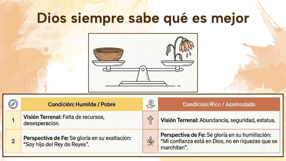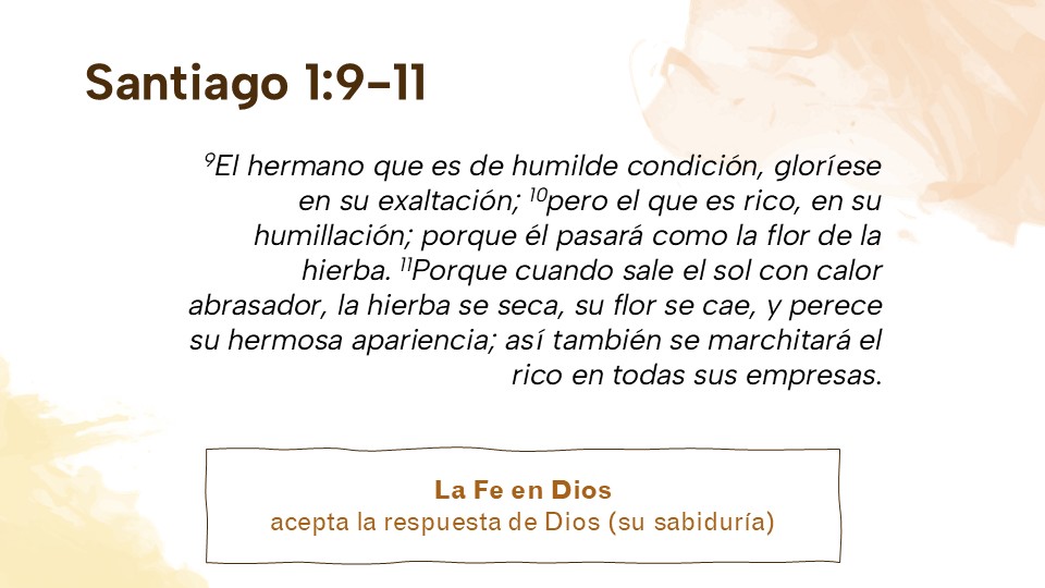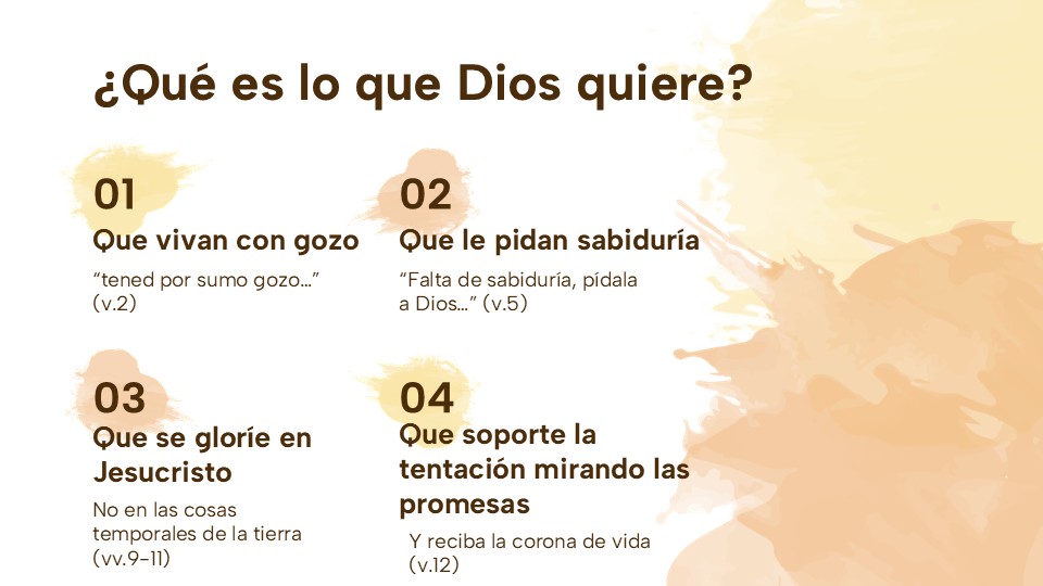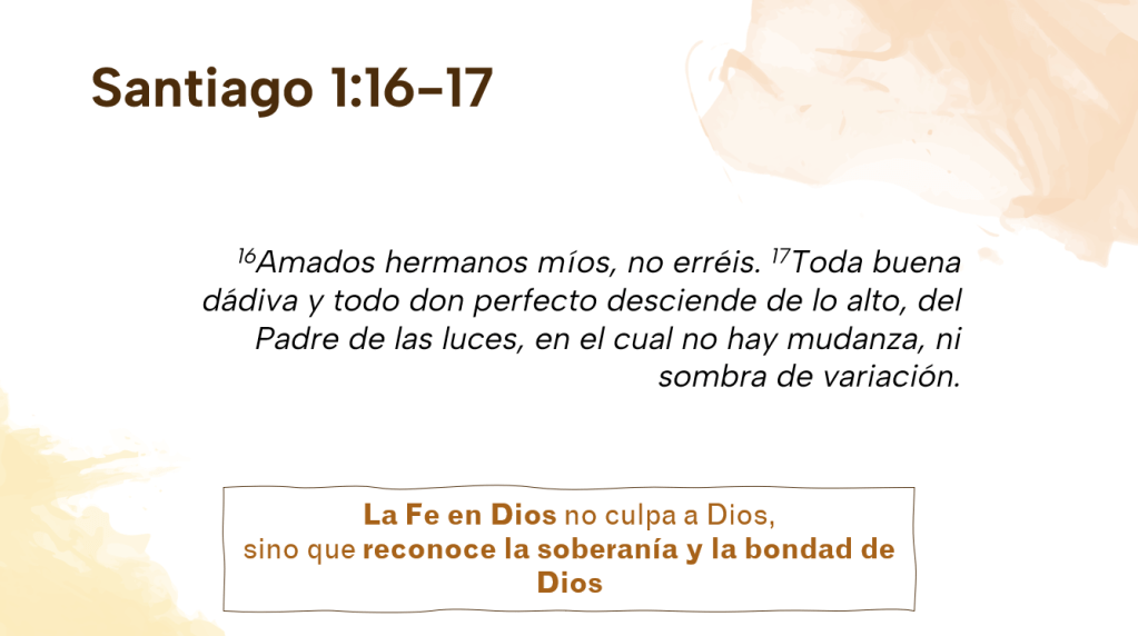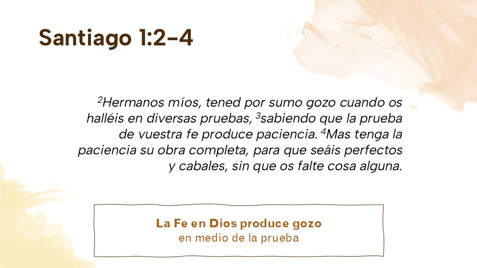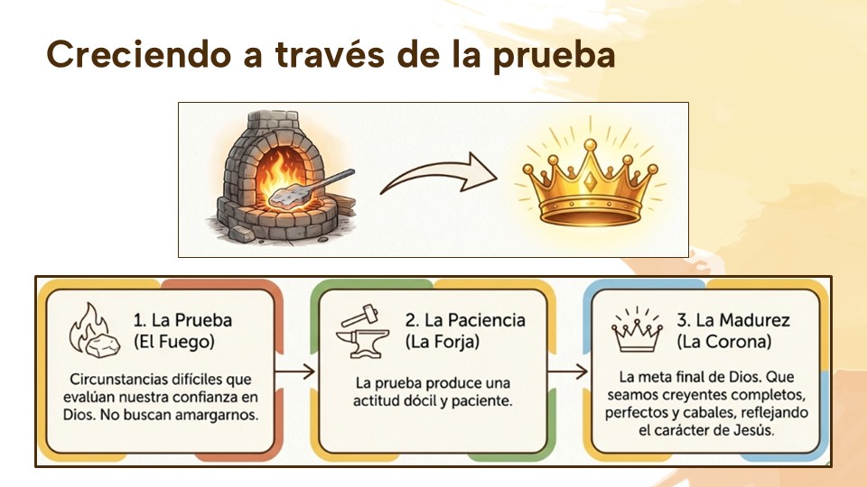 En el tiempo de la prueba, Dios quiere que los creyentes vivamos en conformidad con la fe que tenemos en Jesucristo. Y esta fe genuina en Cristo se puede reflejar: Viviendo con gozo en medio de la prueba; sabiendo que esa prueba perfecciona mi paciencia y me lleva a ser más como Jesús. Pidiendo sabiduría a Dios en medio de la prueba, esperando recibir la respuesta del Señor incluso si es distinta a mis expectativas. Poniendo la mirada en las promesas de Dios en medio de la tentación, pero también reconociendo mi responsabilidad cuando he pecado.