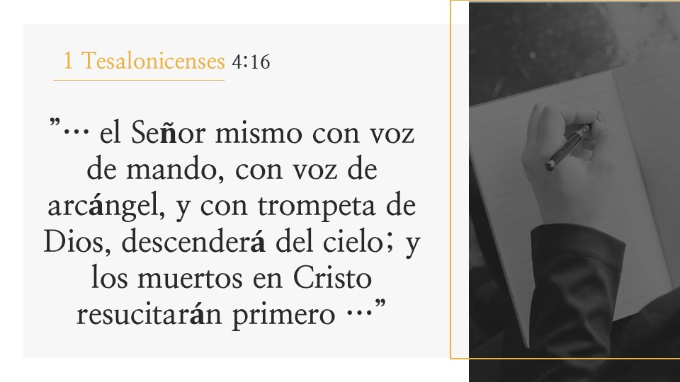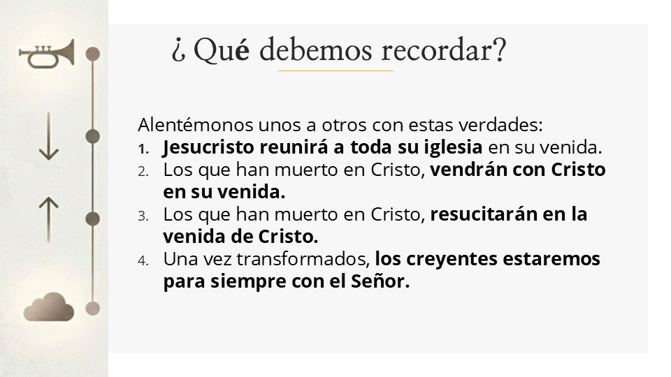 El apóstol les está diciendo: No queremos que ignoren a cerca de los creyentes que han partido ya que, por causa de esta ignorancia, se entristezcan como los otros que no tienen esperanza, porque la verdad es que cuando el Señor regrese, los muertos en Cristo resucitarán primero, y luego nosotros, los que vivimos, los que hayamos quedado, nos reuniremos con ellos para recibir al Señor en el aire. Y no lo digo yo, sino el Señor mismo quien reunirá a toda su iglesia en las nubes con autoridad; voz de mando y con trompeta de Dios.