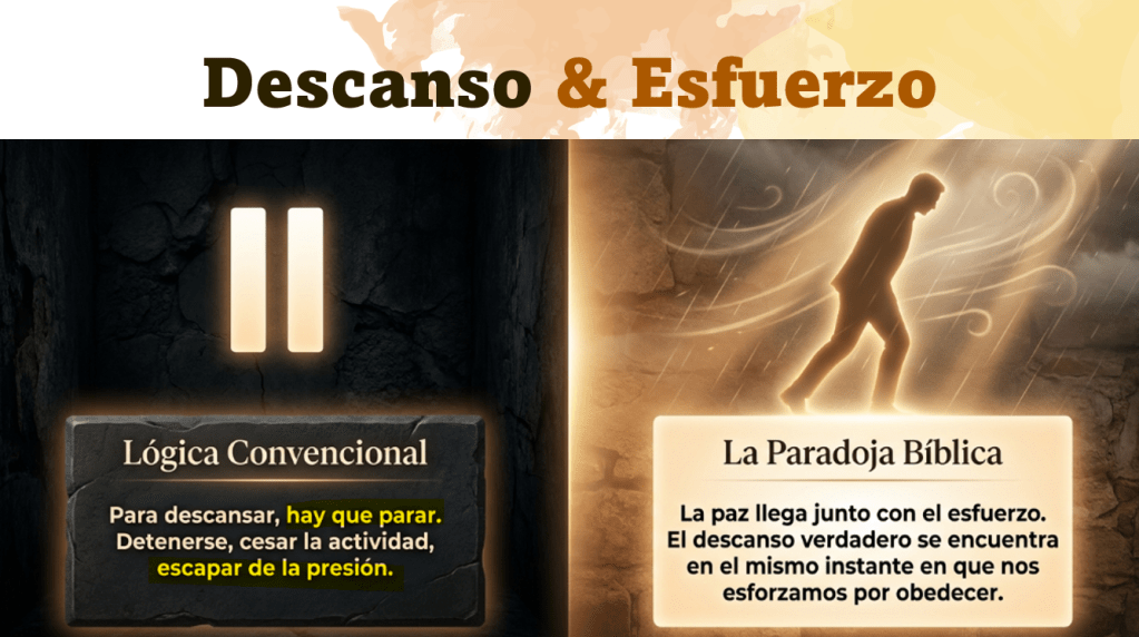 En cuanto al “Esfuerzo y el Trabajo” El consenso general es que Para descansar hay que parar o hay que detenerse y cesar una actividad. Así mismo, para encontrar paz hay que escapar de la presión y del conflicto. Incluso, otros dicen que el descanso viene justo después de haberse esforzado en algo. Sin embargo ¿Qué pasaría si les digo que el descanso que tanto buscamos no está al final de la meta sino en el mismo instante que decidimos obedecer a Dios en medio de nuestras circunstancias?